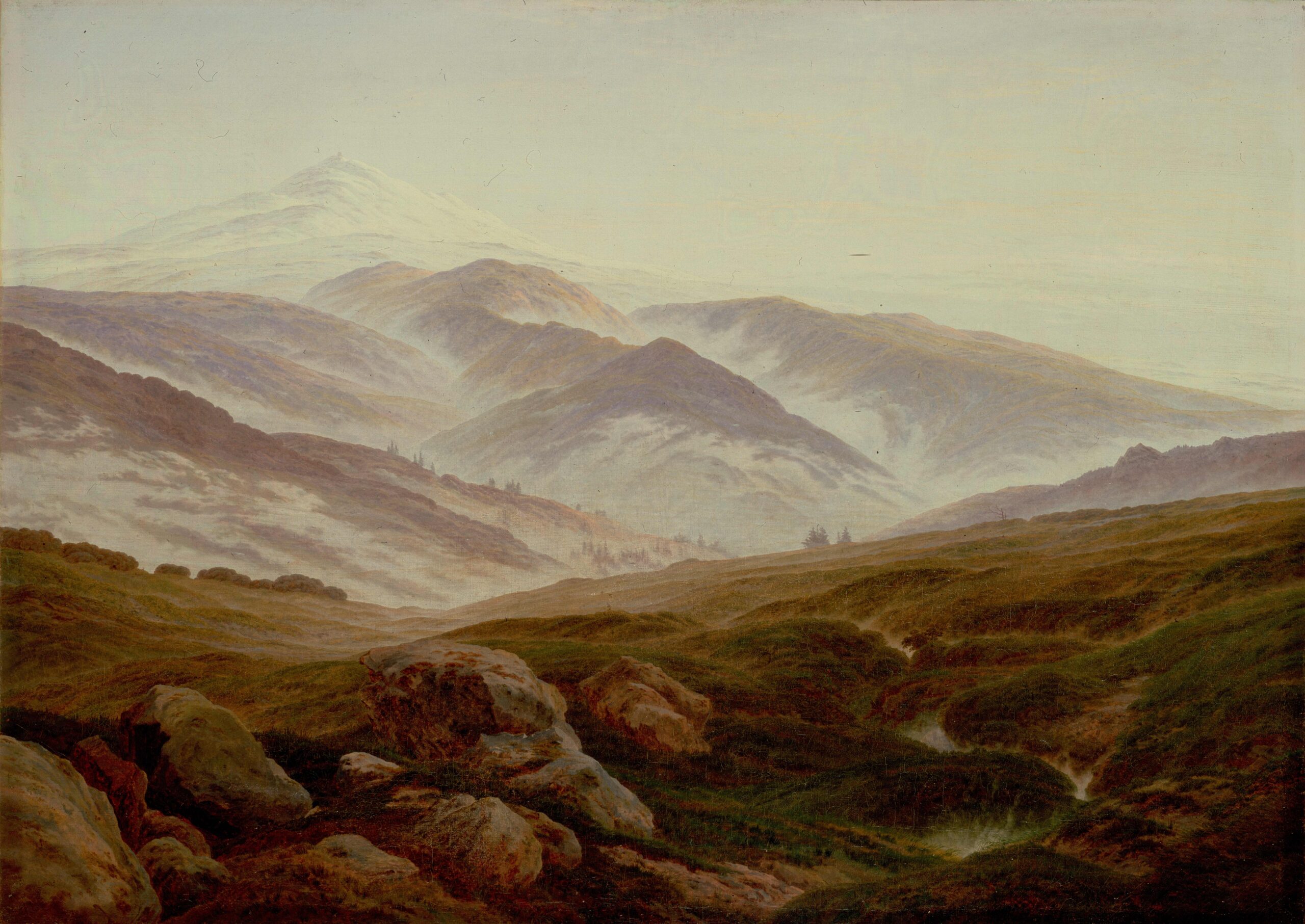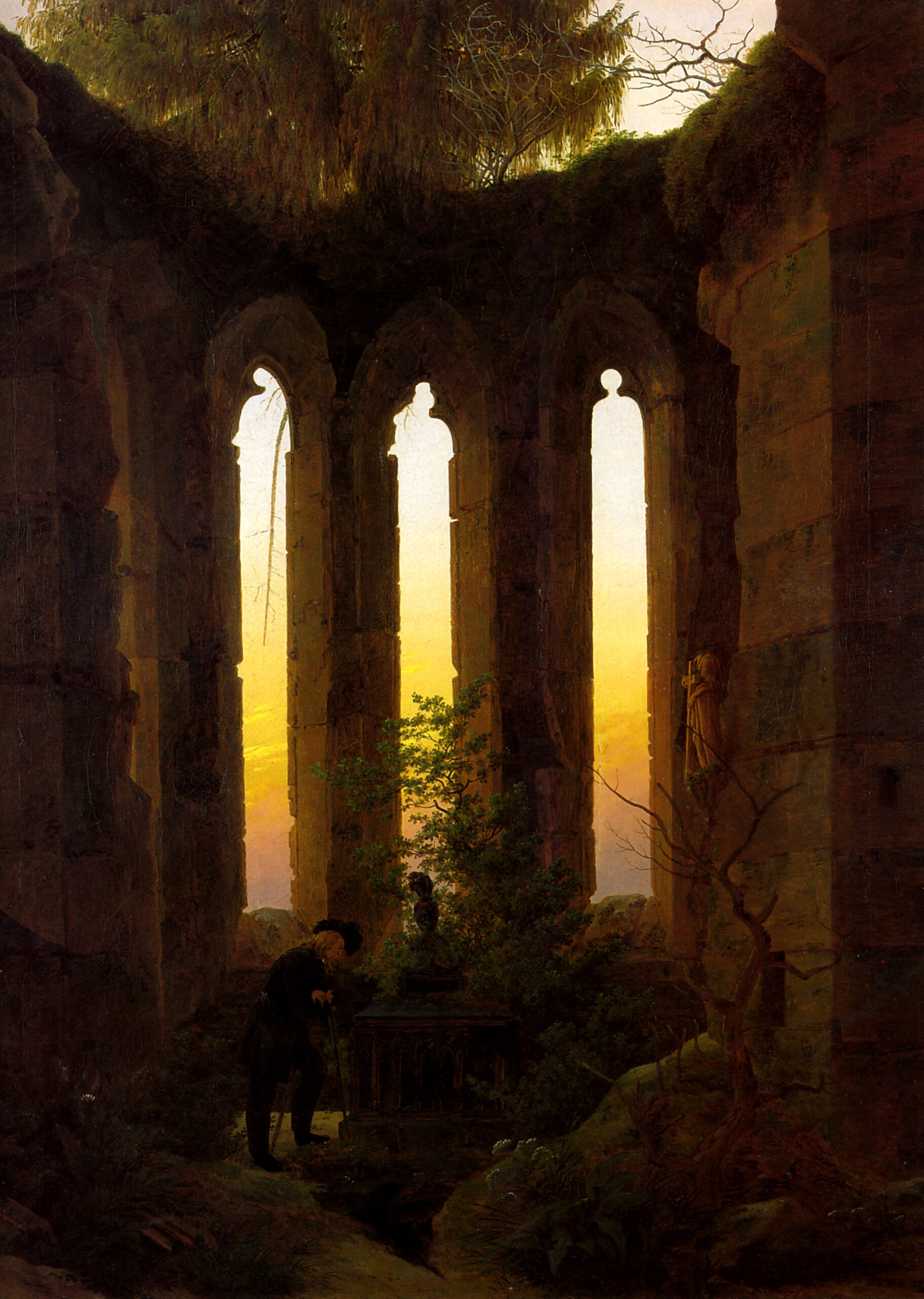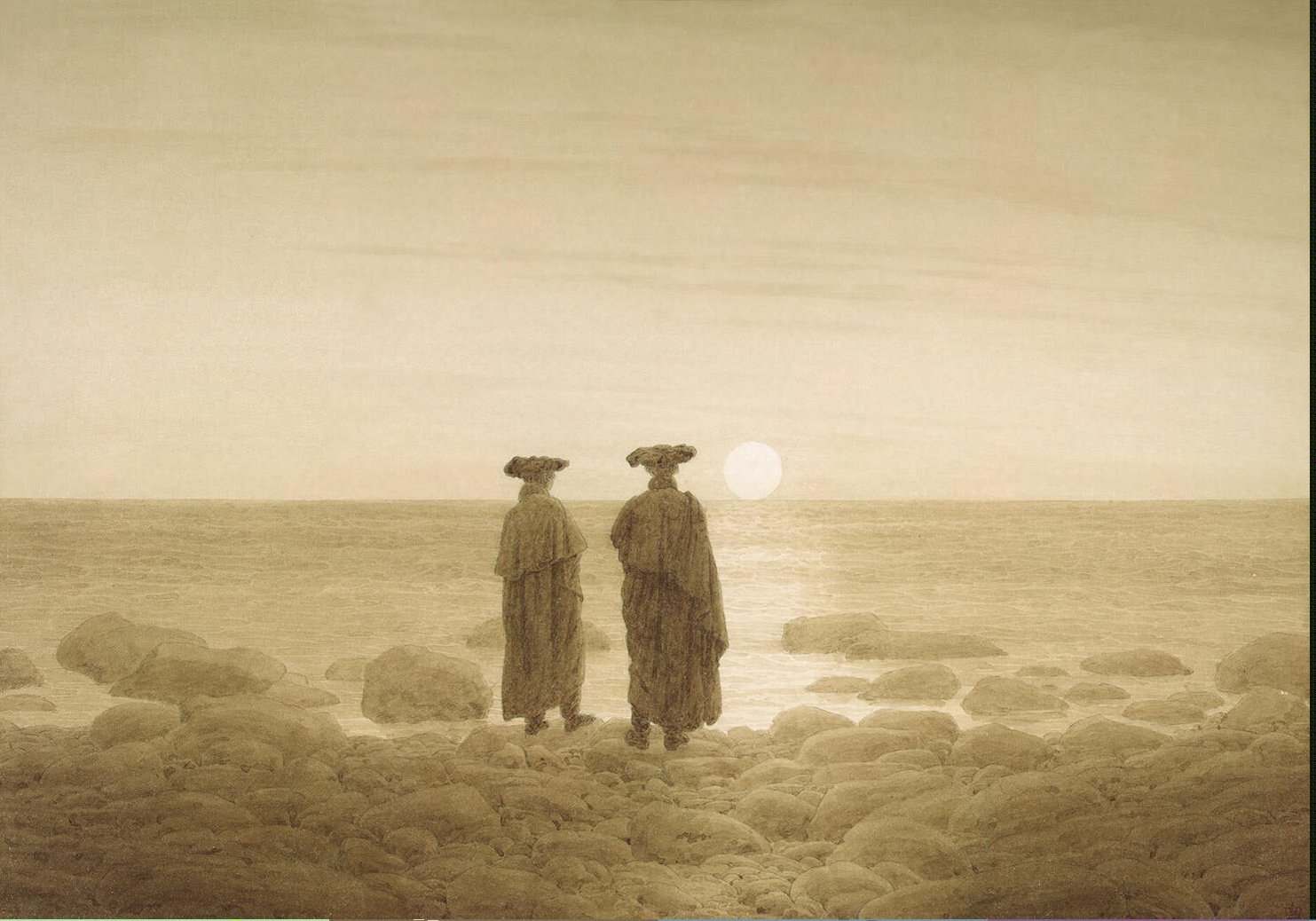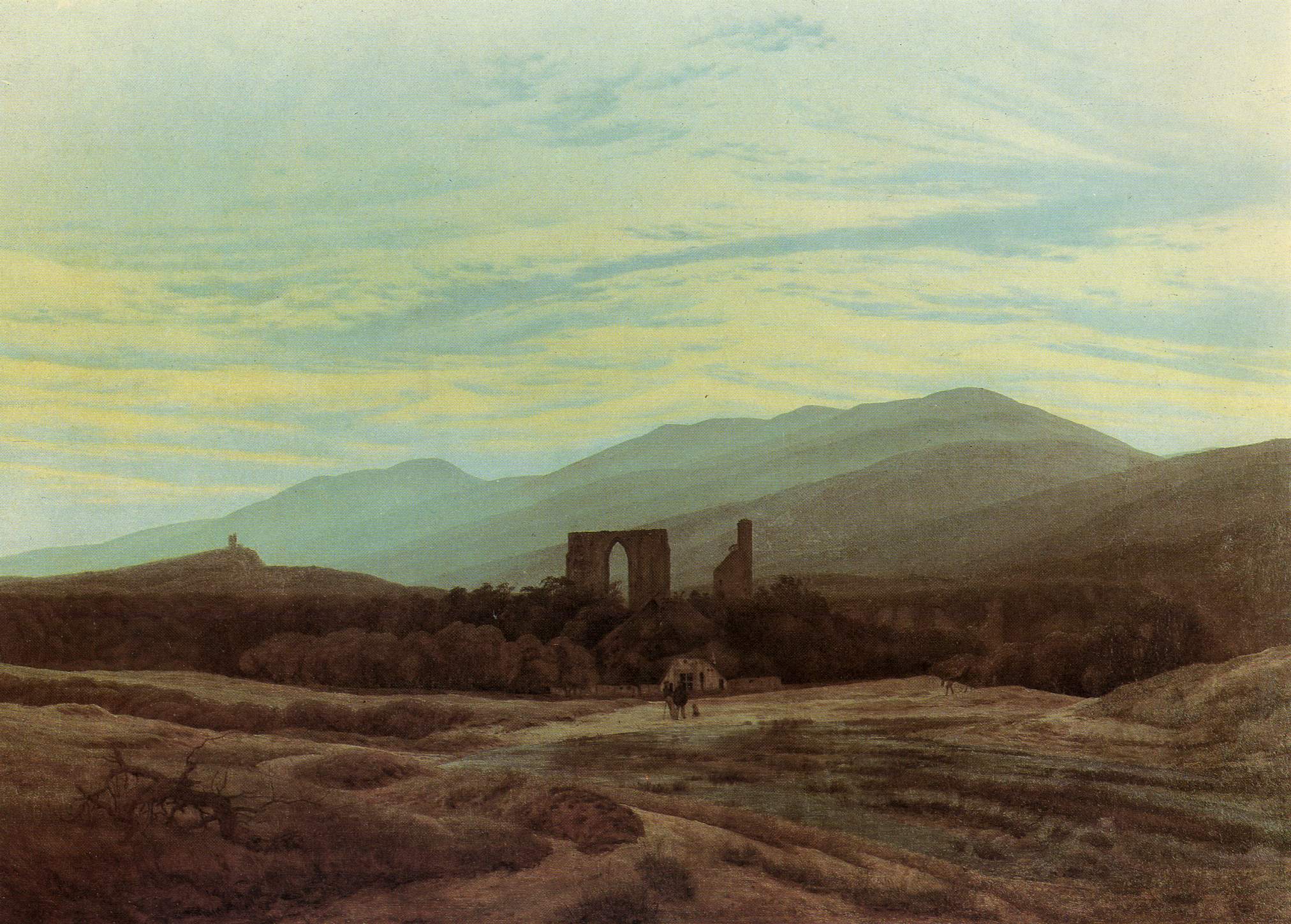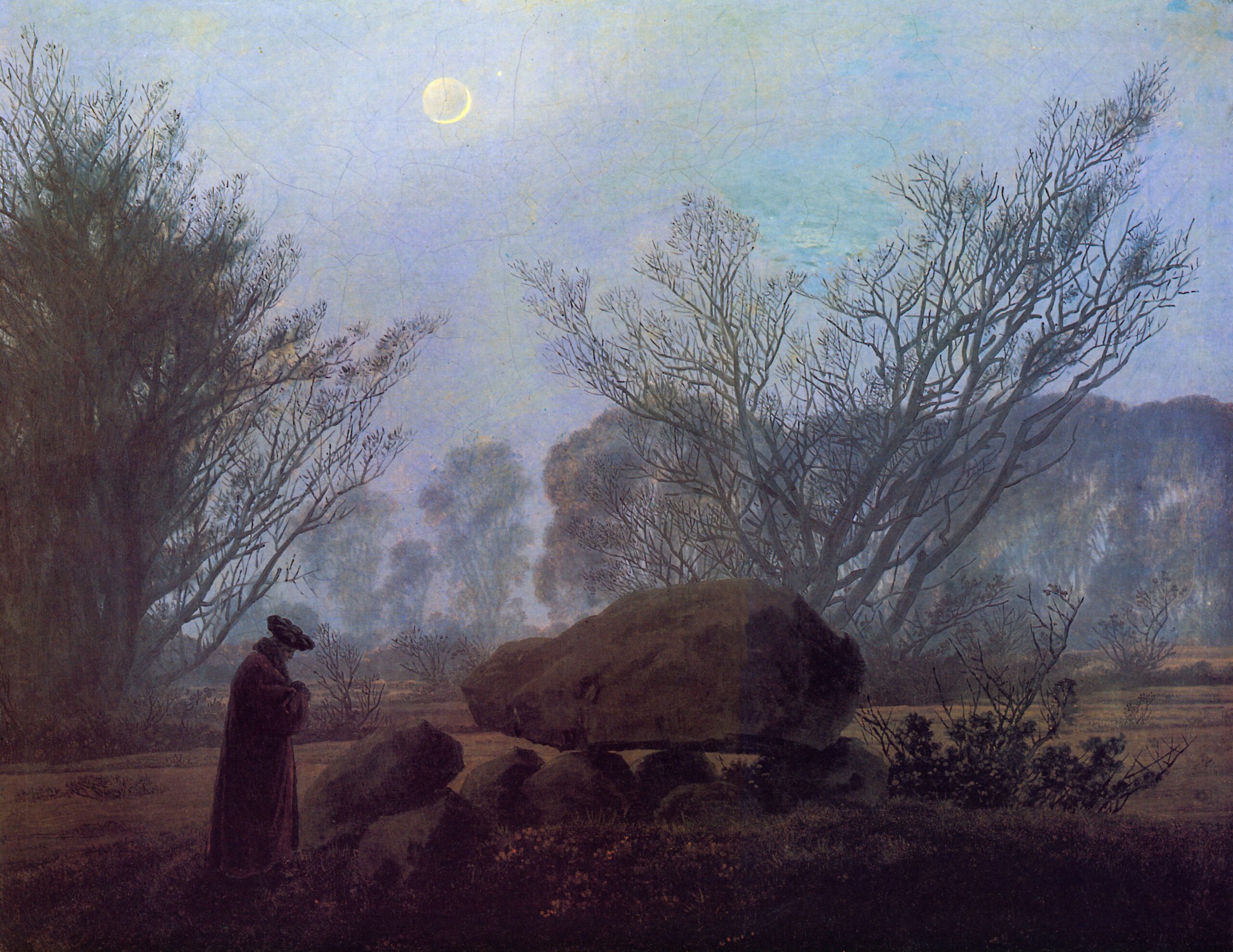 Rather than depicting nature realistically, Friedrich used it symbolically to express ideas of faith, mortality, and the sublime. Motifs such as ruins, mountains, fog, and moonlight recur throughout his work. His compositions invite quiet reflection rather than dramatic action. Although respected by some contemporaries, his art fell out of favor later in his life. Friedrich died in 1840. In the 20th century, his work was rediscovered and recognized as central to Romanticism and modern ideas of landscape and inner experience.