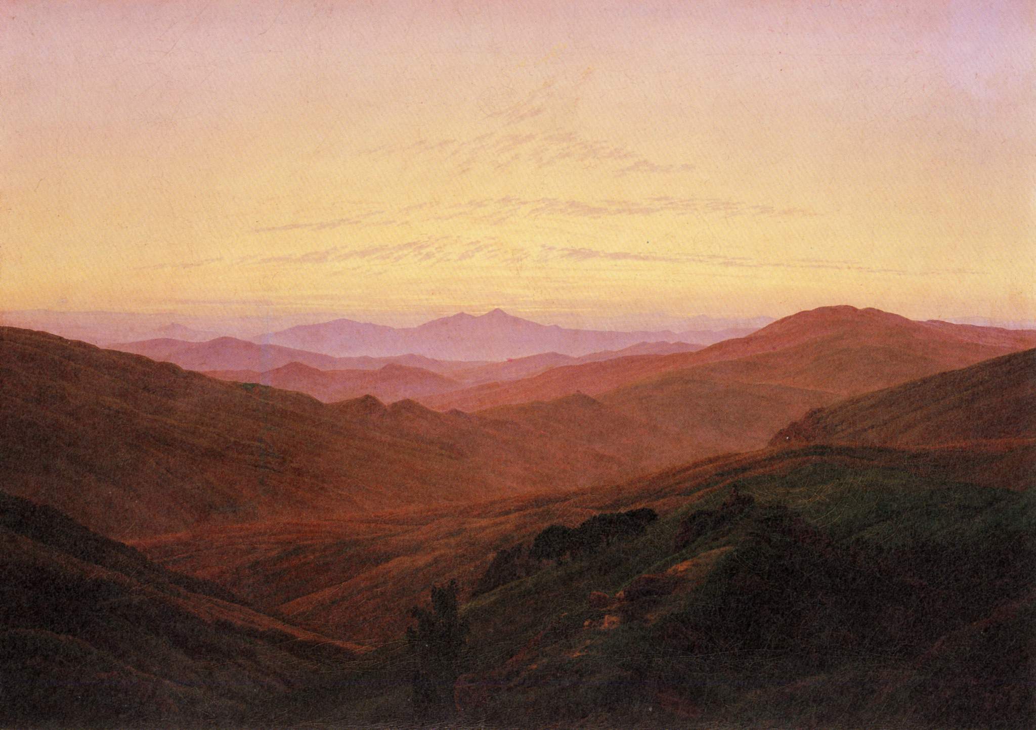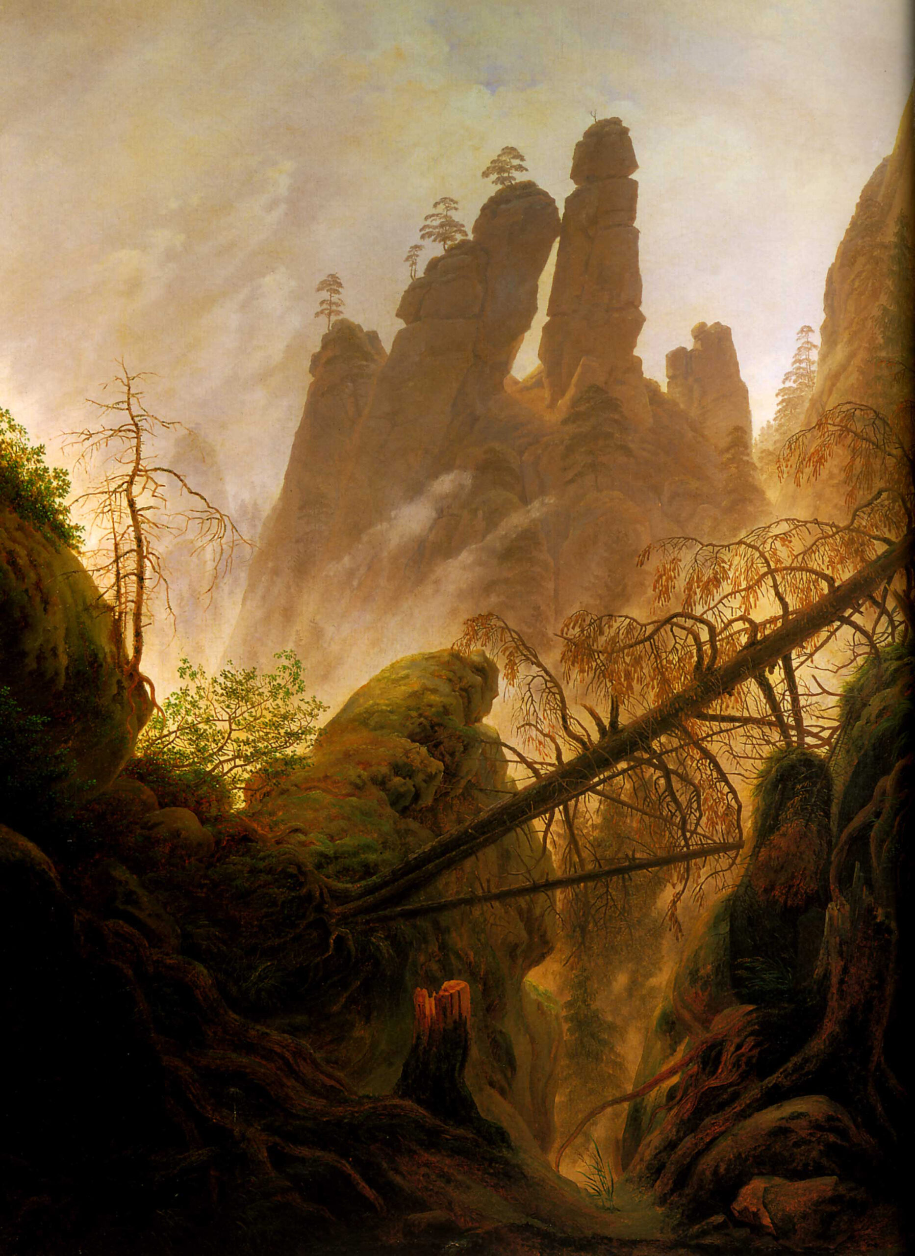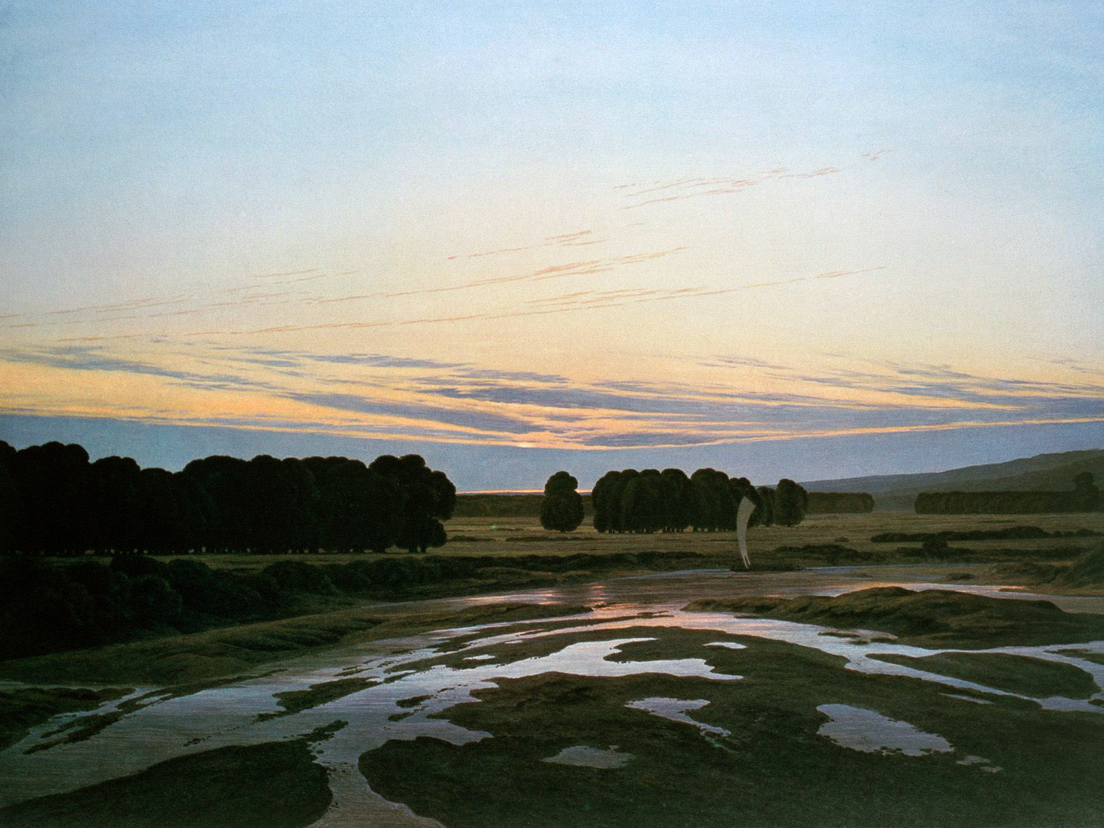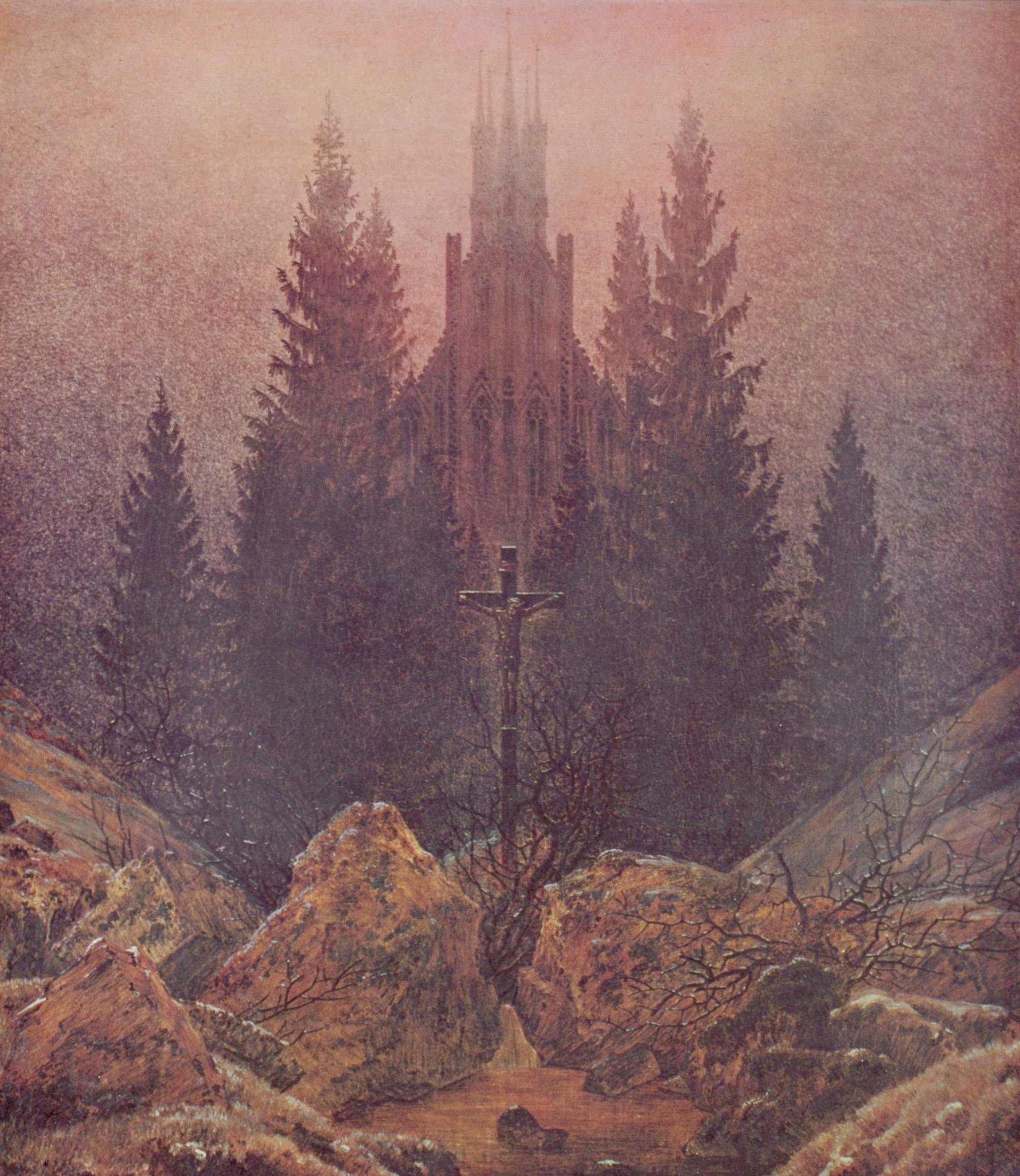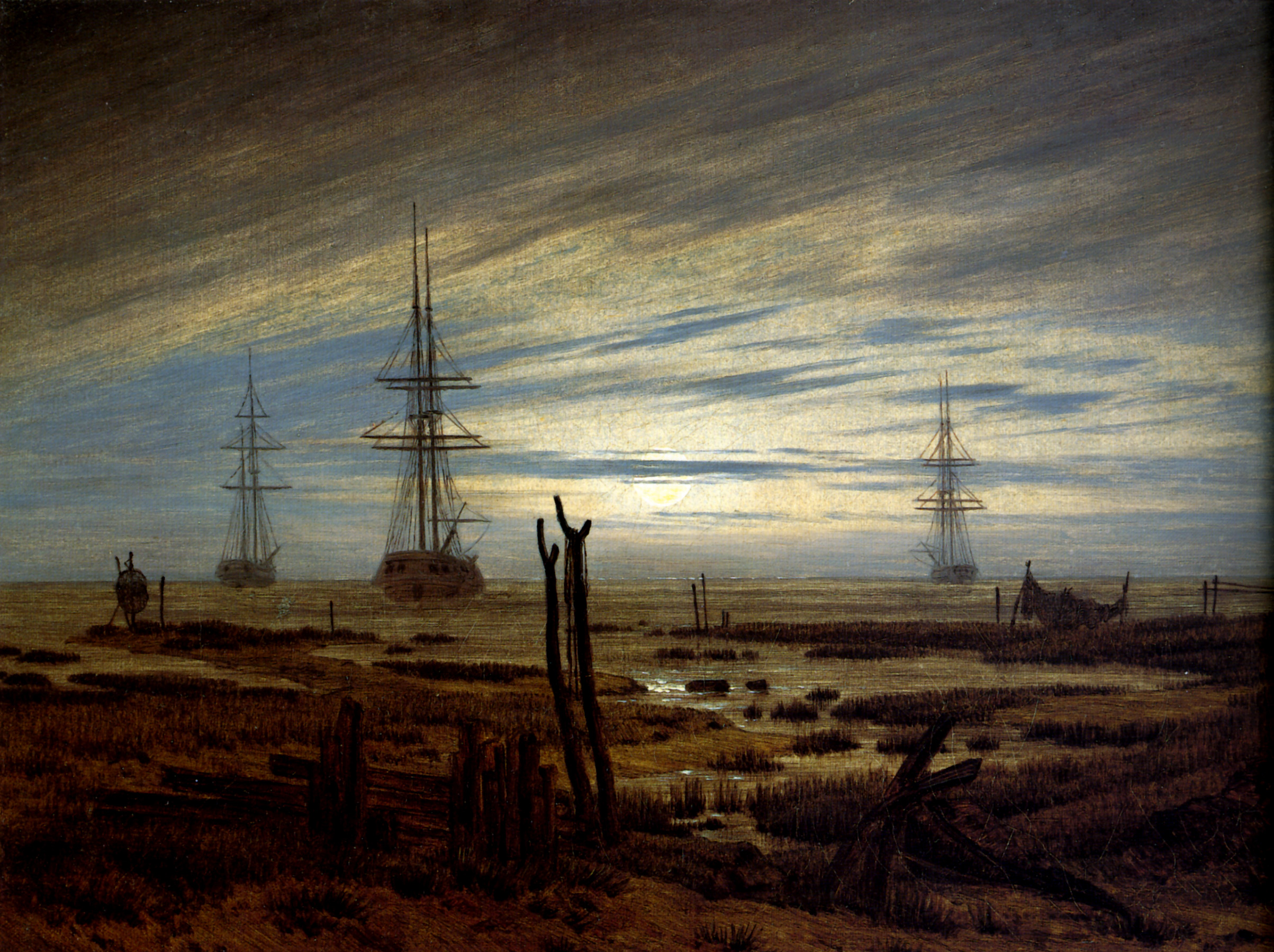 Rather than depicting nature realistically, Friedrich used it symbolically to express ideas of faith, mortality, and the sublime. Motifs such as ruins, mountains, fog, and moonlight recur throughout his work. His compositions invite quiet reflection rather than dramatic action. Although respected by some contemporaries, his art fell out of favor later in his life. Friedrich died in 1840. In the 20th century, his work was rediscovered and recognized as central to Romanticism and modern ideas of landscape and inner experience.