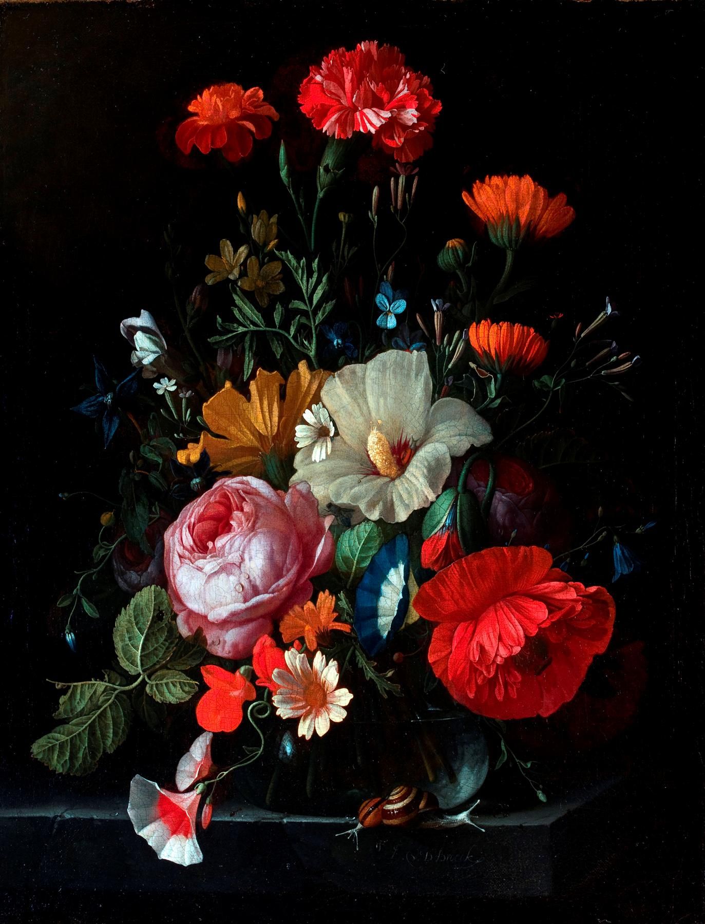 Elias van den Broeck was born in 1650 in Amsterdam and became a notable painter of floral still lifes during the Dutch Golden Age. He studied under Jan Davidsz. de Heem, whose influence is visible in his refined compositions and attention to detail. Van den Broeck is best known for richly colored bouquets arranged against dark backgrounds. His paintings often feature insects, leaves, and subtle signs of decay alongside blooming flowers.