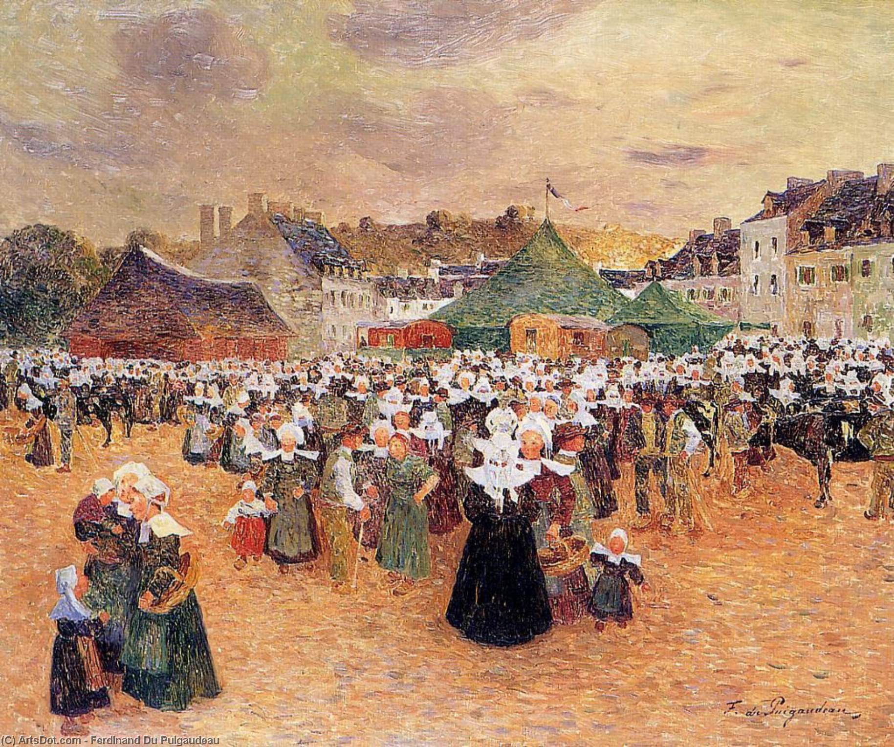 Ferdinand du Puigaudeau was born in 1864 in Nantes, France, and became a painter associated with Post-Impressionism and Symbolist tendencies. He studied in Paris and was influenced by artists such as Claude Monet and Paul Gauguin. Du Puigaudeau is best known for his luminous scenes of festivals, markets, and nocturnal gatherings illuminated by artificial light. His work often captures the glow of lanterns, fireworks, and sunset skies.